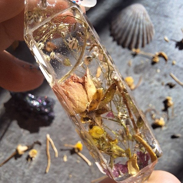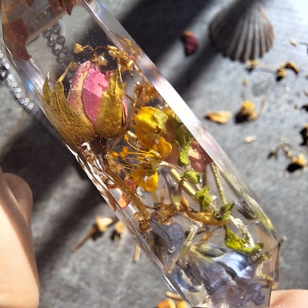 🌸 Dije de resina en forma de péndulo con flores y hierbas naturales